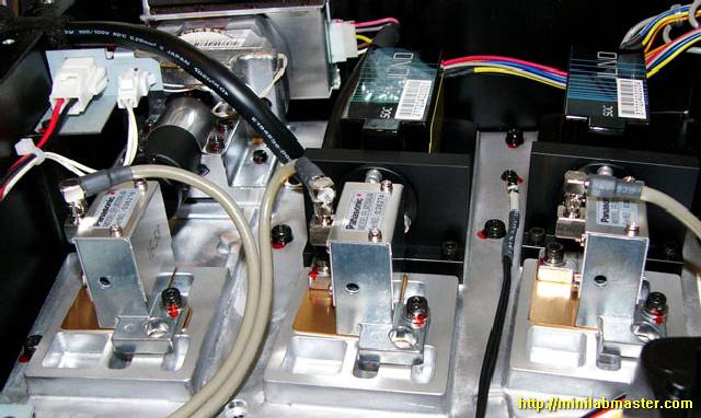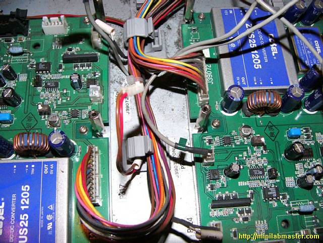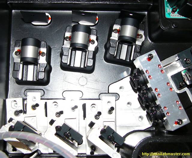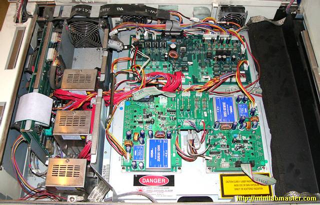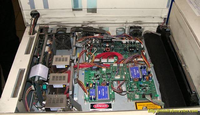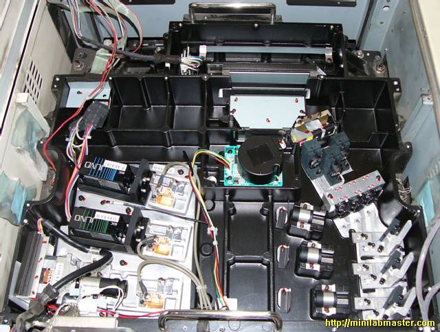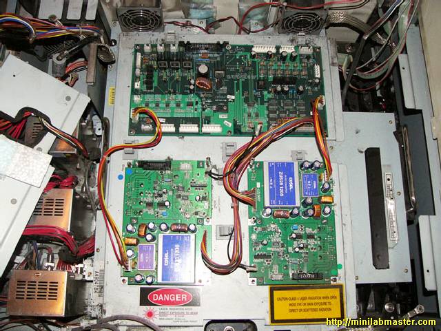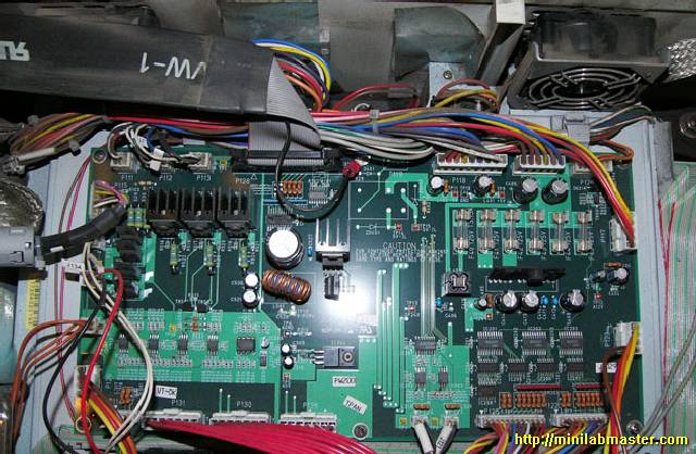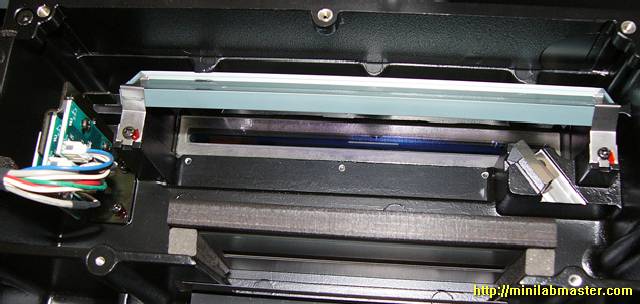I enjoyed the contemplation of the random flashing LEDs on the green card, thought for a while, and decided once again to open the lid, which hides the laser unit. I looked again at the board, and was taken aback: the cable pulled, caught in the memory module and bent his eight! I'm not going to show you this picture because spoil other people's property for the second time is not good to take a picture of it ... Apparently, the Chinese who are manufacturing minilabs Noritsu save to all, including cable length, and at night, from saved staff gather minilabs for itself :-).
