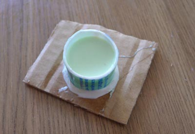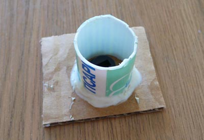 Для начала сделаем своеобразную "опалубку": на картон установим пластиковое кольцо, отрезанное от упаковки каких-то таблеток. По периметру заделаем щели пластилином. Вовнуть покладём наш образец пластиковой детали, которую мы копируем. Теперь эту деталь можно заливать силиконом, чтобы получилась силиконовая форма для отливки копии пластикового изделия.